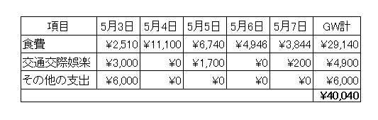 5万円の予算でしたので、予算内に納まっています。食費やレジャー費が多いのはこのGW関連支出の為です。